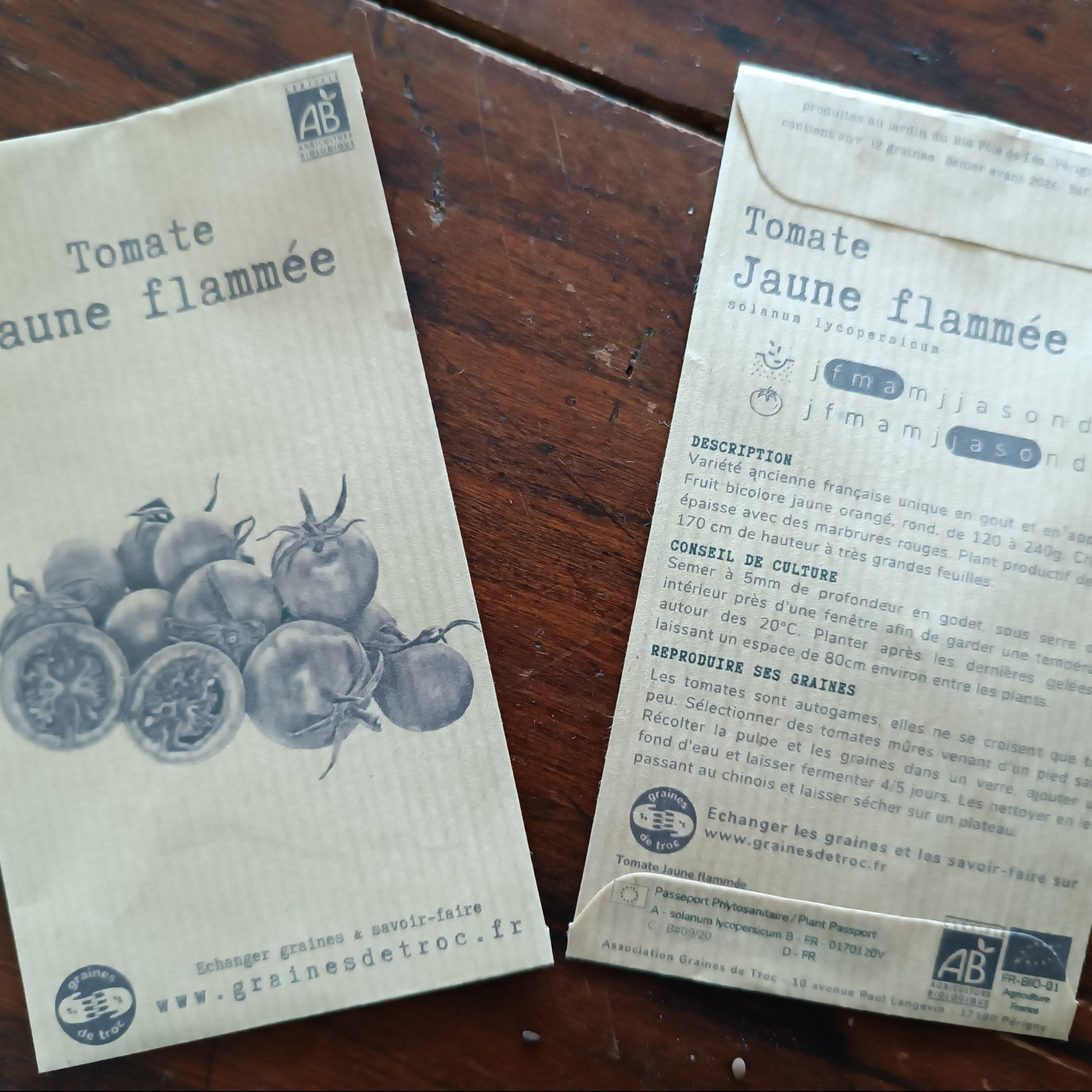Variété ancienne française unique en gout et en apparence. Fruit bicolore jaune orangé, rond, de 120 à 240g. Chair peu épaisse avec des marbrures rouges. Plant productif de 150 à 170 cm de hauteur à très grandes feuilles.